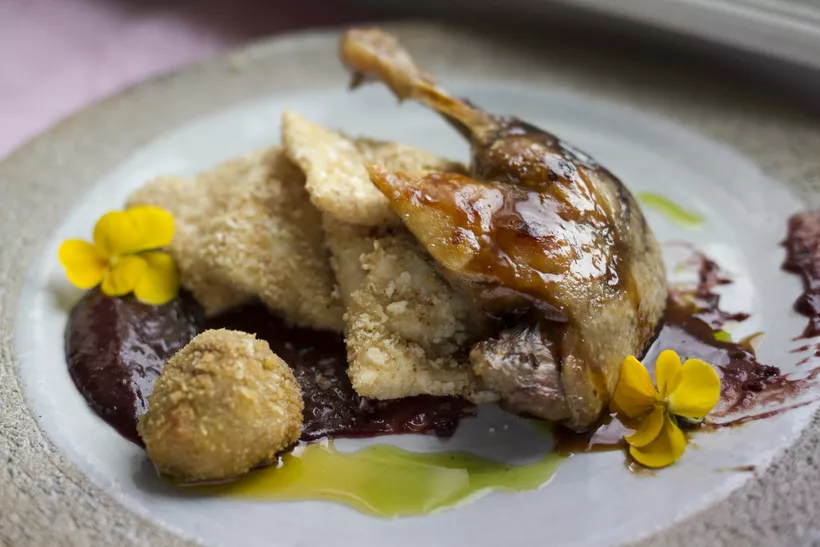 A Dűlő ízeivel először egy gasztronómiai fesztiválon találkoztunk, és azzal a határozott szándékkal érkeztünk az étterembe, hogy az akkor kóstolt kacsamájzserbót mindenképpen megízleljük újra. Az előétel nagy örömünkre szerepel az étlapon, és természetesen éppen olyan, mint emlékeinkben. Egyszerre sós és édes, a málna könnyűvé és vagánnyá teszi a fogást. Épp annyi benne az újítás, amennyit egy hagyományos ízekhez szokott vendég is szívesen fogad, de a gasztronómia mélyebb bugyraiba elmerülők is találnak benne finoman elrejtett meglepetéseket.