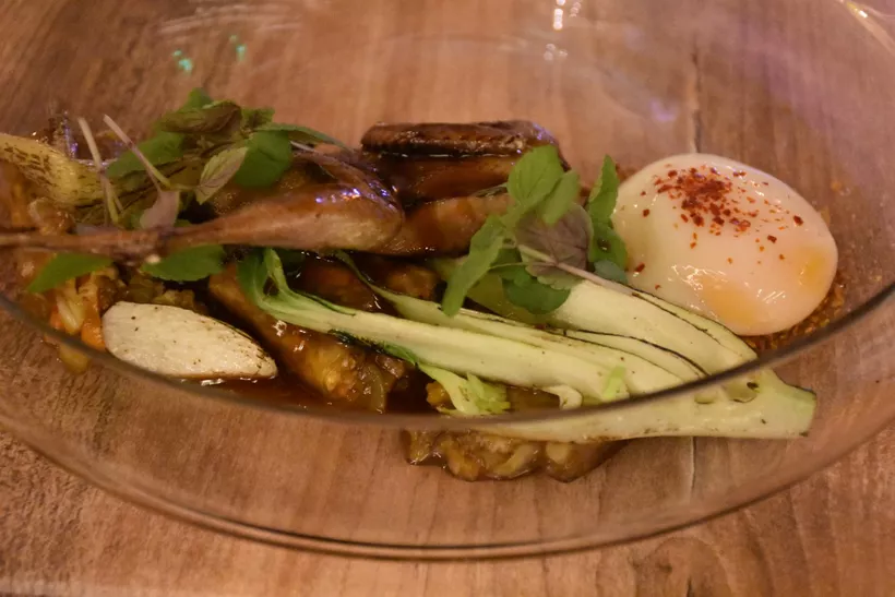 Első főételünkhöz a Nagyköret cím passzol. A centrumba emelt fürj ugyanis elveszett a gazdag, önálló életre kelt köretben: szuvidált tyúktojás, aminek ismét jól állt a kimcsipaprika-szórás, bébizöldségek sütve, zöldségvariációk tamarindba áztatva, majd rizslapba tekerve.