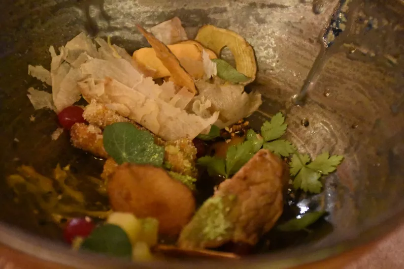 Második üdvözlőfalat: Magyar zöldségek Ázsiában nyaralnak. A tányéron szezonális téli zöldségek: lila káposzta és karalábé, melyek két különféle textúrában alkotnak harmóniát a currys tigrisrákkal. Önmagukban is nagyon különlegesek, a curry aromája elegánsan jelenik meg. Van még a fogásban savanyított ananász is, ami mintha valamiféle ficánkoló ifjúként akarna a „nagyok” játékába beleszólni.