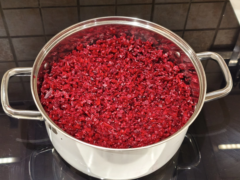 Megjegyzés: a fenti recept 1 kg céklához szól, én 5 nagy, összesen két és fél kiló céklából készítettem el - jól fog jönni az ünnepekkor nemcsak a reggelizőasztalnál, hanem sültek mellé is fogom tálalni, úgy, ahogy a kompótot vagy újabban a csatnit - de kis üvegekbe töltve kreatív és személyre szóló karácsonyi ajándéknak is tökéletes. Azt is be kell vallanom, hogy az eredeti receptben apró kockára vágták a céklát - én a blenderhez folyamodtam, hogy meggyorsítsam az elkészítési folyamatot. Ebben a verzióban szirupban főzzük a céklát, de ha valakinek van ideje saját levében főzni, különösen ha nagyon friss, még lédús céklát kap, kipróbálhatja, hogy a felkockázott céklát összekeveri a cukorral és az edényt lefedve legalább egy éjszakára állni hagyja – én így látatlanban akár egy napig is hagynám állni a keveréket. Ha annyi levet nyerünk, hogy a céklát nagyjából ellepi, akkor vizet sem adnék hozzá, mert a cékla a lassú főzés során tovább ereszti a levét.