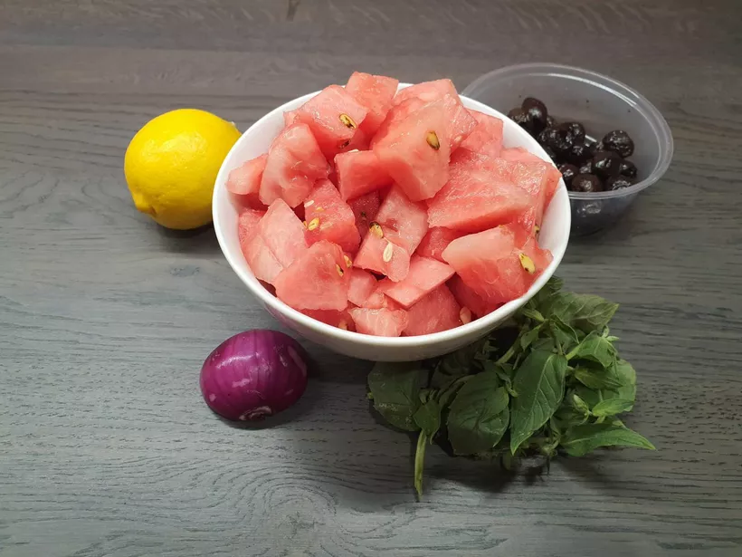 2.A görögdinnyét és a sajtot felkockázzuk, a hagymát csíkokra vágjuk, és az egészet finoman összekeverjük.