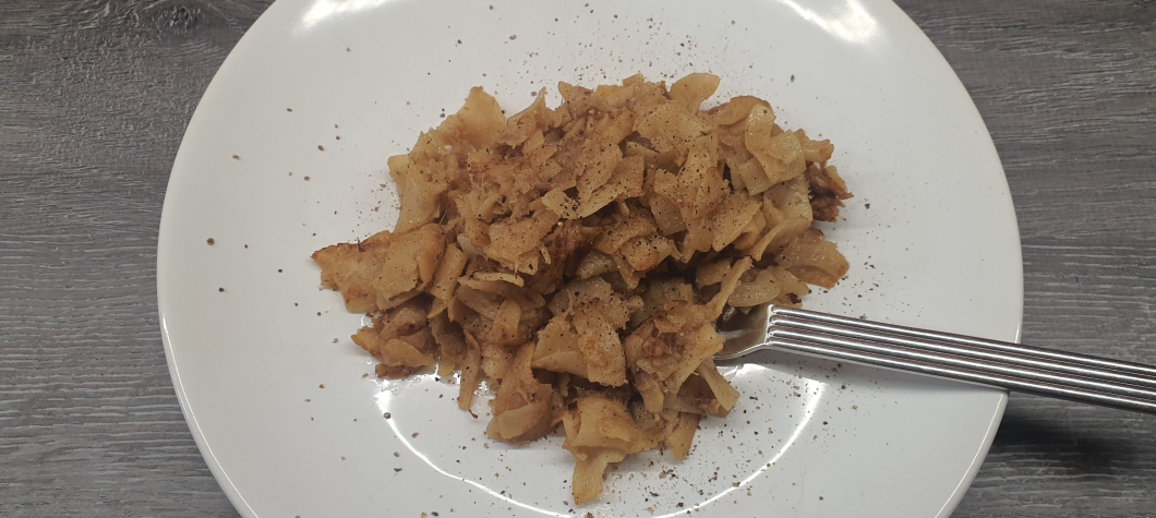 6.A megpárolt-pirított káposztát megszórjuk őrölt borssal, majd belezuttyantjuk a kifőzött, leszűrt tésztát, és alaposan összeforgatjuk.