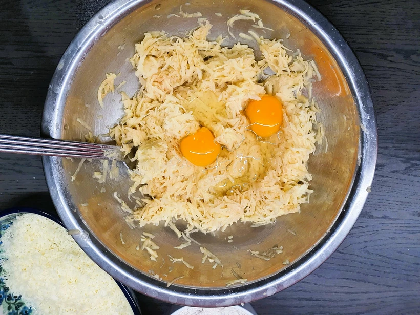 1. A krumplit meghámozzuk, nagylyukú reszelőn lereszeljük, megsózzuk, összekeverjük, és 10 percre állni hagyjuk. Amíg áll, lereszeljük a sajtot, és a sütőt előmelegítjük 180 fokosra.