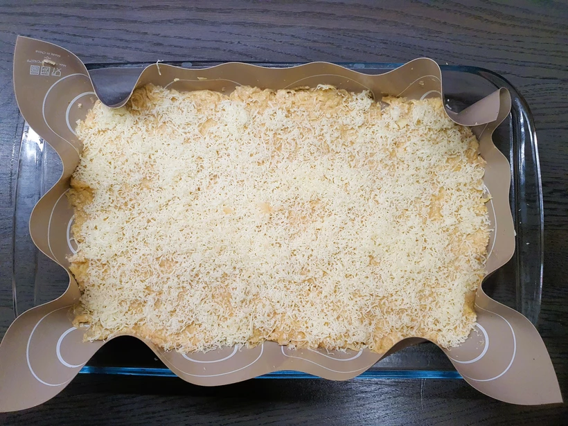 4. Sütőpapírral kibélelünk egy közepes méretű tepsit, belesimítjuk a masszát, a tetejét egyenletesen megszórjuk a reszelt sajttal, és betoljuk a sütőbe. Addig sütjük, míg a sajt meg nem pirul a tetején.
