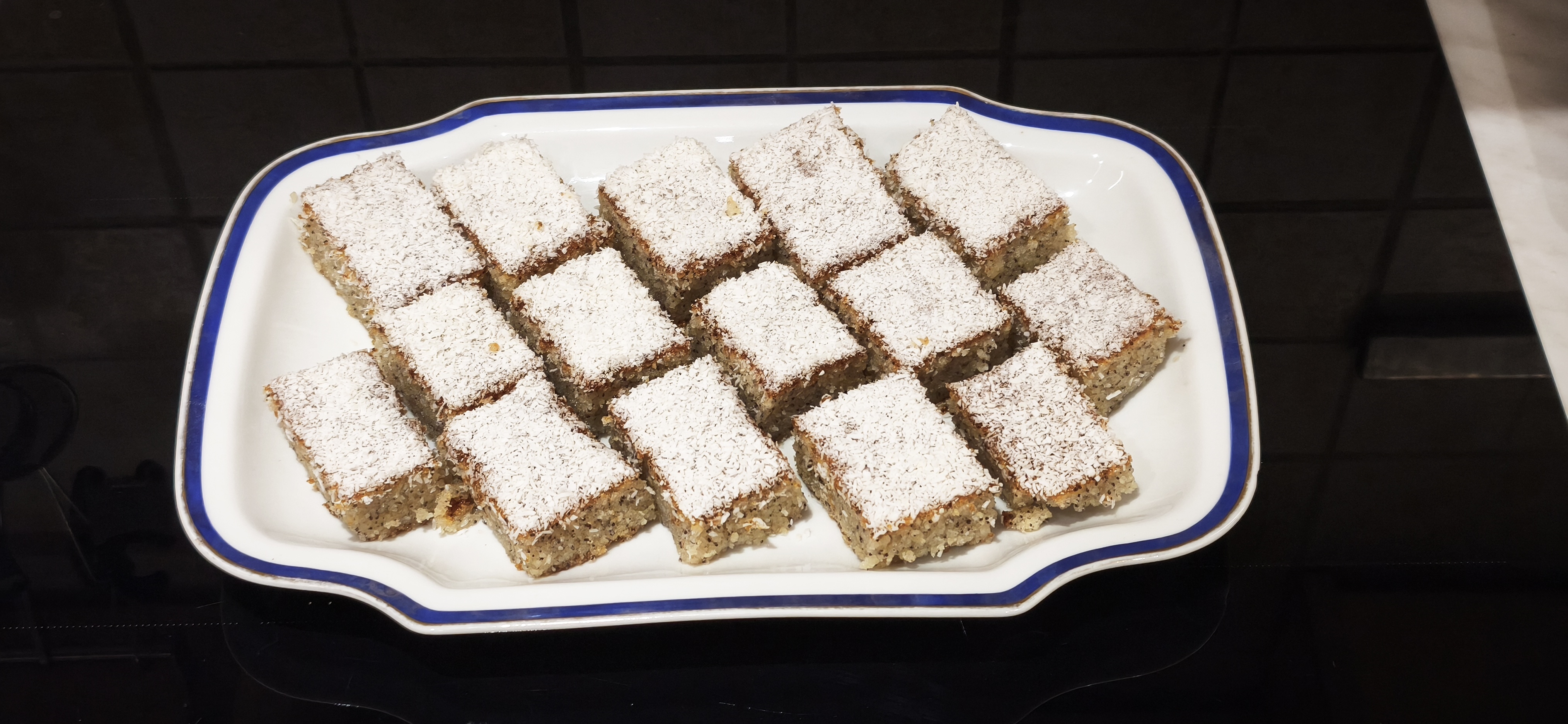 7. A sütemény tetejére közvetlenül a sziruppal való megöntözés után egy réteg kókuszreszelék kerül, de díszíthetjük a mák ízvilágához passzoló gyümölcsökkel, esetleg felvert és a szeletelés előtt a sütemény tetejére simított cukrászhabbal is.