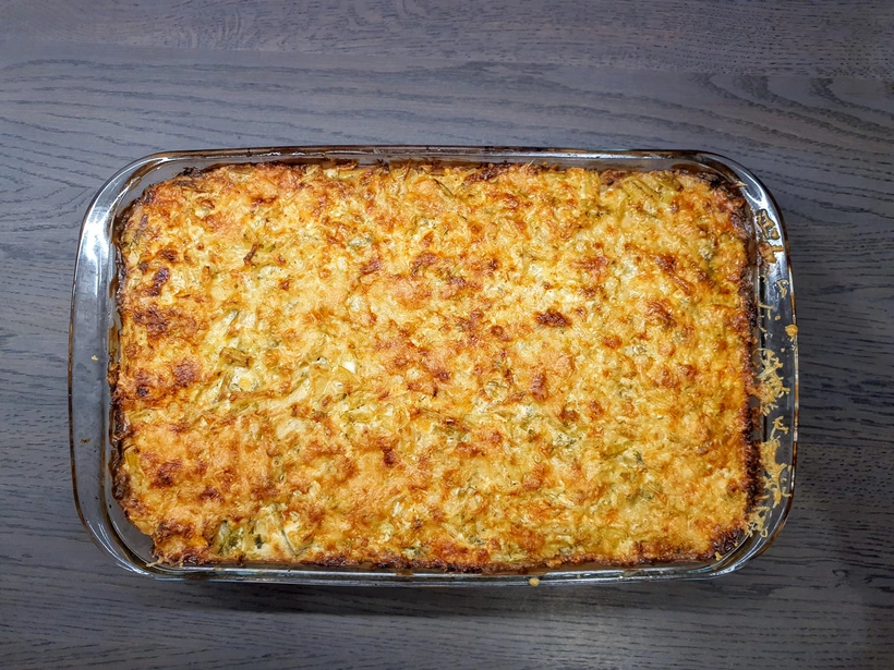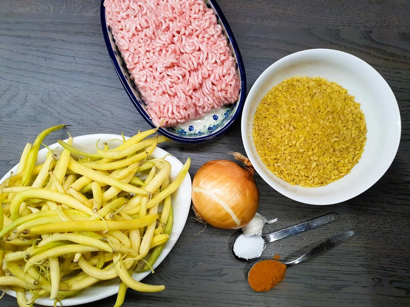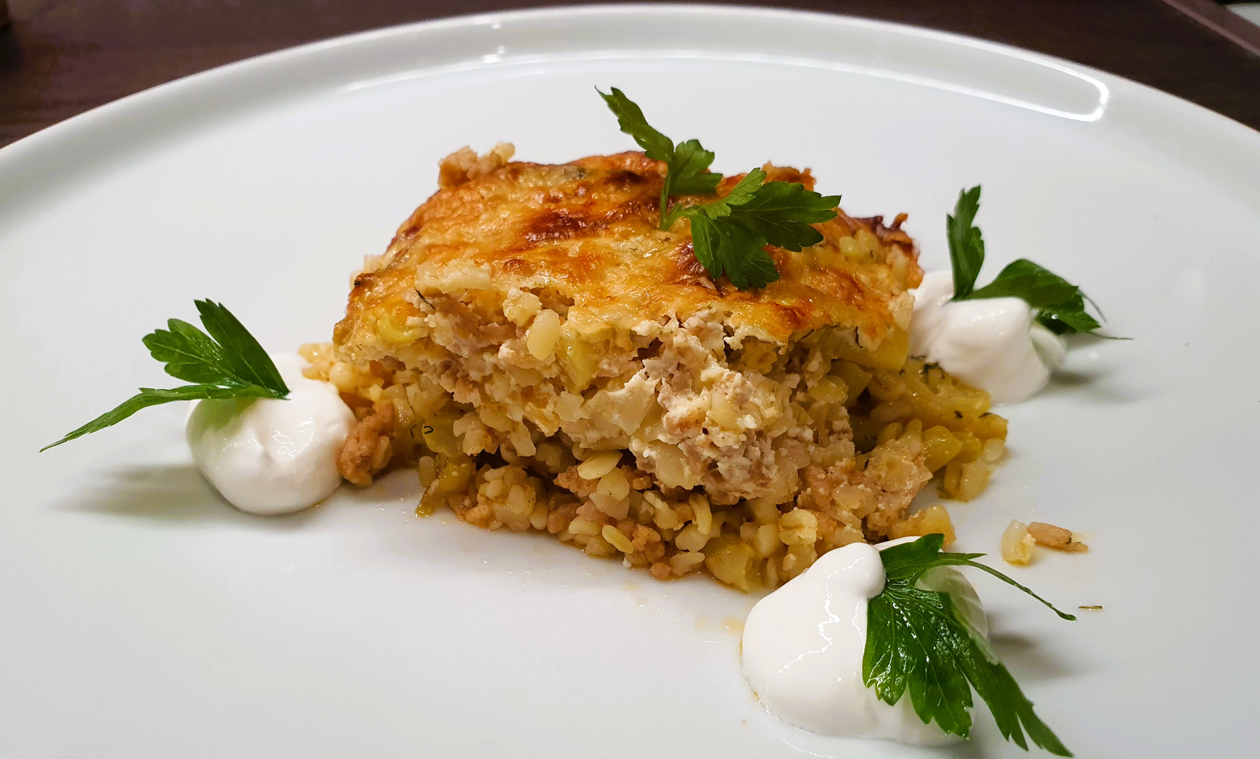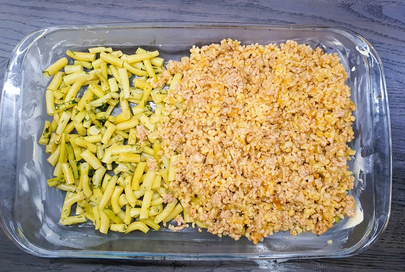 4. A maradék vajjal kikenjük egy jénai tál alját, rálapátoljuk a zöldbab felét, majd egyenletesen elterítjük rajta a bulgur felét. Jöhet a darált hús, a tetején elsimítjuk a tejföl felét, aztán a maradék bulgur és a maradék zöldbab következik, végül mehet rá a tejföl másik fele. Jó alaposan megszórjuk reszelt sajttal, és 180 fokos sütőben 25 perc alatt megsütjük. Akkor jó, ha a sajt megpirul a tetején, ennek érdekében – ha szükséges – süthetjük egy kicsit tovább.