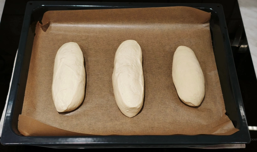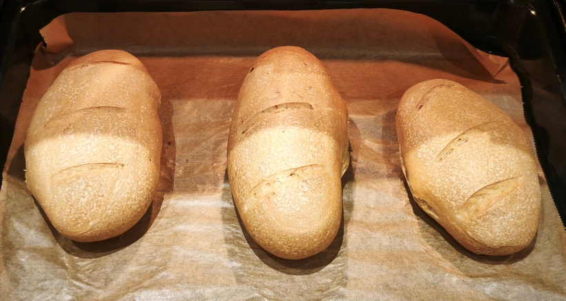 A tepsit kibéleljük sütőpapírral, beletesszük a három veknit, és letakarva további 30–40 percig hagyjuk kelni. Ha újra megkelt a tésztánk, egyszersmind kissé ki is szárad a felülete – ekkor a tetejüket nagyon éles késsel vagy borotvapengével három helyen fél-fél centi mélyen bevágjuk, majd átkenjük őket egy kevés vízzel. Végül 200 fokra előmelegített sütőben – legkeverés nélkül – 30-40 perc alatt kisütjük.