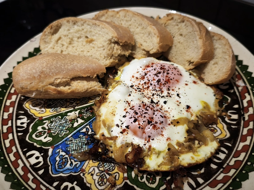 Idővel a soğanlama „leszivárgott” a palotából Anatólia különböző vidékeire, és számos helyi változata született. Közép-Anatóliában – Aksaray, Kırşehir környékén – a név alatt ma már gyakran húsos, esetleg tésztás egytálételeket értenek, máshol soğan mıhlaması, soğan öldürmesi vagy soğan aşı néven él tovább a hagymás-tojásos vonal. A Fekete-tenger mellékén a kıymalı soğan mıhlaması lett a reggelizőasztal sztárja: itt darált hús, paprika, paradicsom és tojás egészíti ki a sok hagymát. A mi receptünk ehhez a palotai eredetű, de ma már teljesen domesztikált, reggelizős soğanlama-vonalhoz kapcsolódik: kevés, de jó minőségű alapanyag, lassan párolt hagyma, a tetején lágyra hagyott tojásokkal – tökéletes mártogatós egy kosár friss, meleg kenyér mellé – ezért mutatok egy rendkívül egyszerű ropogóskenyér-receptet is hozzá.