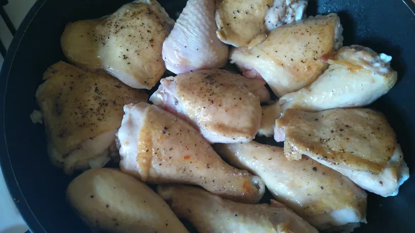 - A csirkecombokat sózzuk, borsozzuk, majd olívaolajon mindkét oldalukat megpirítjuk.