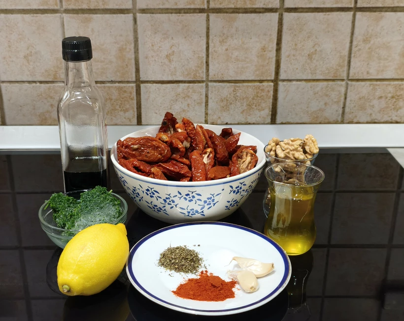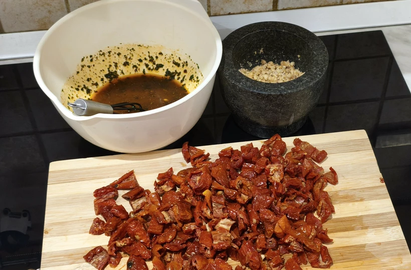 1. A szárított paradicsomot néhány órára tiszta vízbe áztatjuk, majd leszűrjük és felaprítjuk.