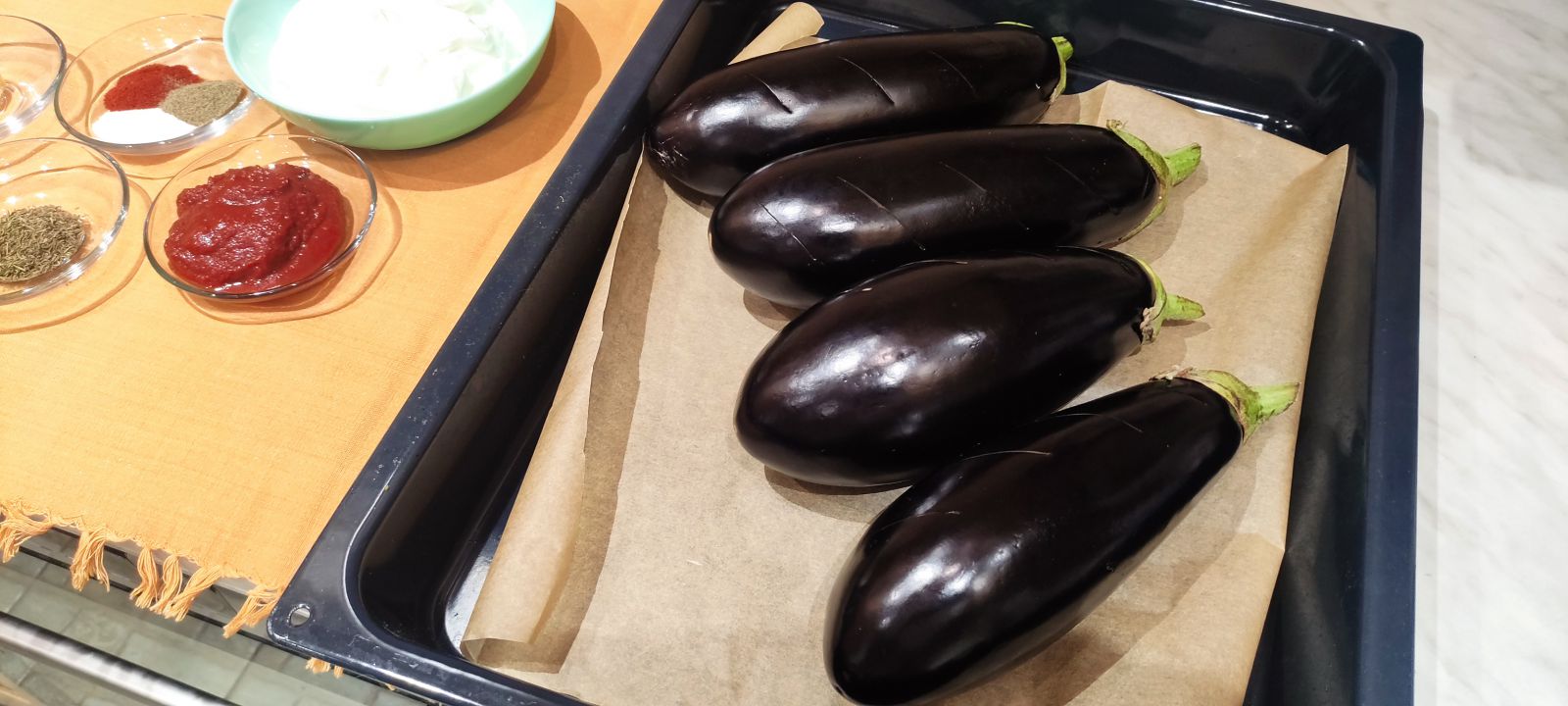 1.A padlizsánkrémhez mossuk meg és megszurkálva vagy késsel kissé beirdalva süssük meg a padlizsánokat 200 fokon. Nem baj, ha sütéskor némi pörkanyag is képződik. (A tálaláshoz grillezhetünk a padlizsán mellett fejenként egy-egy kápia paprikát is.)