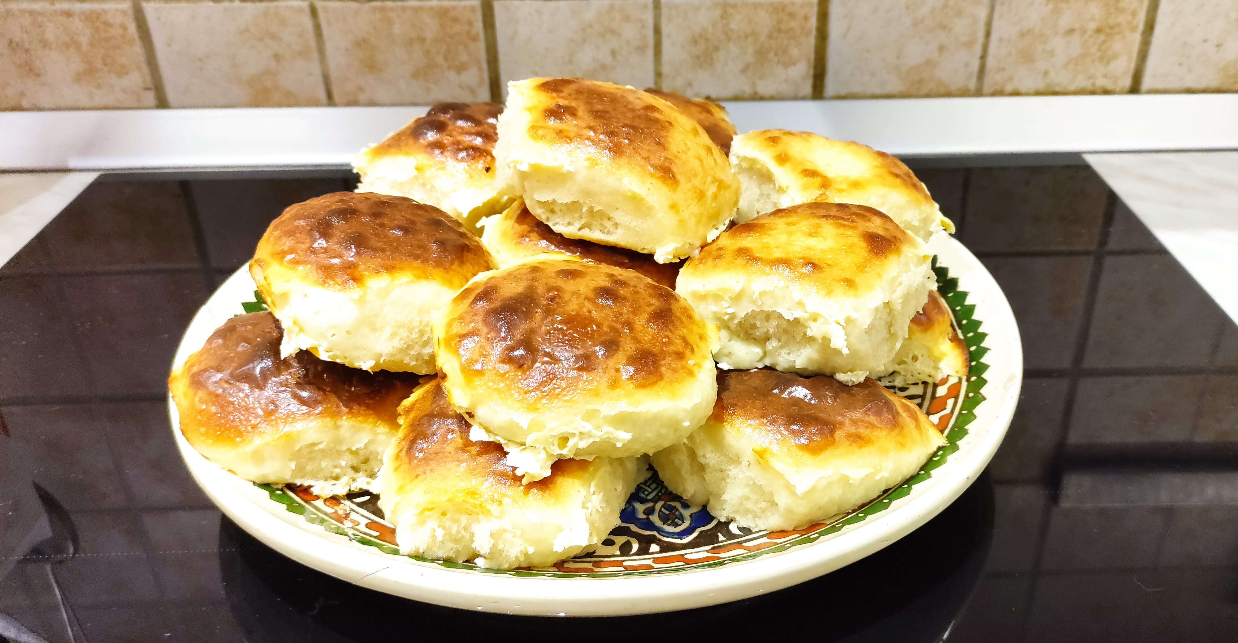 2. A megkelt tésztát 16 részre osztjuk, és gombócokat formázunk belőlük, majd a tenyerünkben kis lepény formájúra szétnyomkodjuk. Mindegyik közepébe egy kis darab fehér sajtot teszünk, majd a tésztát összezárjuk.