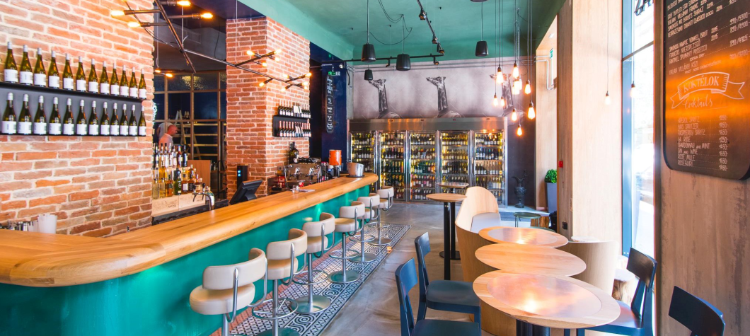 Nagynak nagy, tagadhatatlan, mégis bensőséges. A kétszintes, lazán elegáns belső teret Csap Viktor tervezte, akinek finom humorát jól mutatják a kissé szokatlan, ám annál szerethetőbb építészeti megoldások. A téglaburkolattól meleg, mégis furcsán indusztriális hangulatban a méltóságot a borok képviselik, de a dizájn gondoskodik róla, hogy ne süppedjünk nagyon mélyre a borszakértés mocsarában. A vicces fejű zsiráfok, a neonarcú Dionüszosz, a színes fények, a dzsungelmintás tapéta, a rafináltan elhelyezett tükrök és a kóstolóterembe tévedt tűzpiros ló folyamatosan arra figyelmeztet bennünket, hogy az élet élvezetéhez nem elég a jó bor, kell hozzá egy kis humorérzék is.