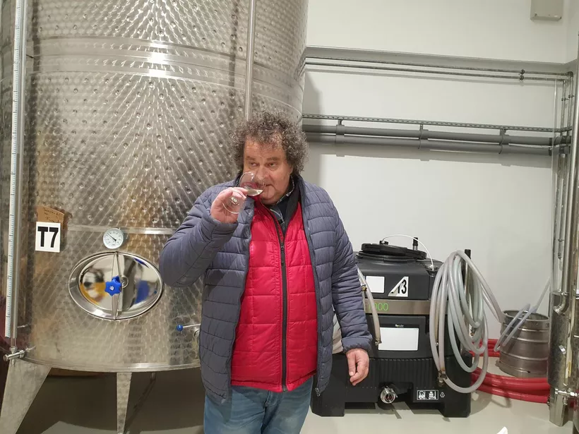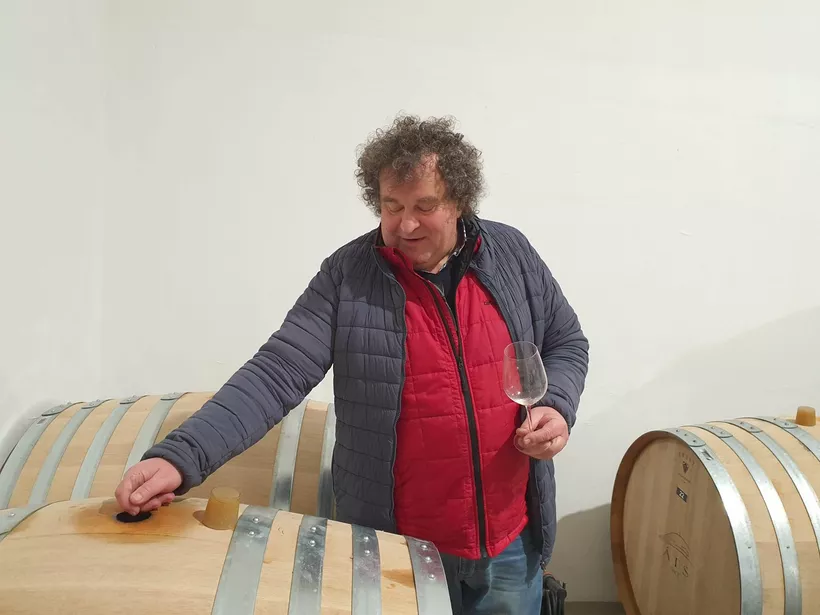 „Akartok látni valami érdekeset” – kérdezi vendéglátónk, és nem vár választ. Mi másért is lennénk ott, mint hogy akarjunk látni valami érdekeset! Ugyanazt a bort kapjuk, mint az előbb, csak egy másik hordóból. Ég és föld. A szövete ugyanolyan sűrű, de ebben nincs semmi kedvesség: grépfrútos, kesernyés, szikár, fanyar.