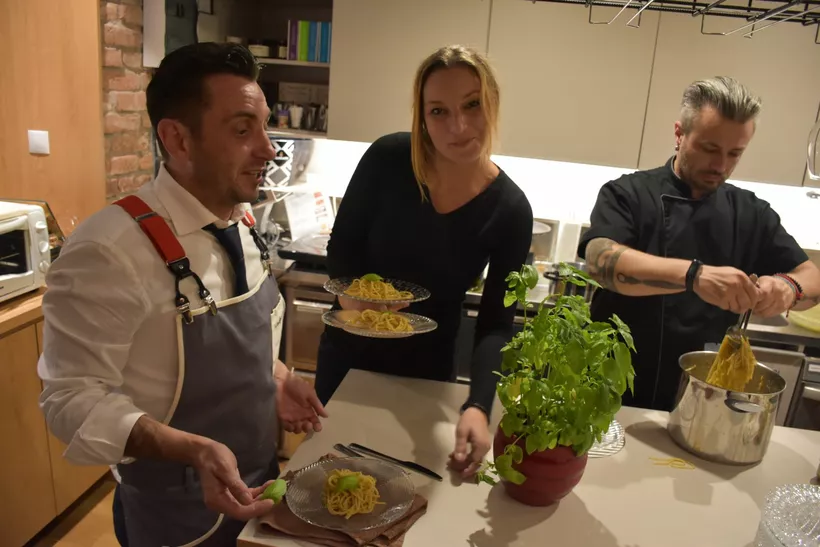 Üdvözlőitalként remek proseccót kaptunk, majd színre léptek az est főszereplői: Dura Emese, a háziasszony, Angerman László sommelier és Hornyák Antal, a Divina Italia olasz élelmiszereket forgalmazó cég vezetője, aki a kísérőételeket készítő séfet is magával hozta.