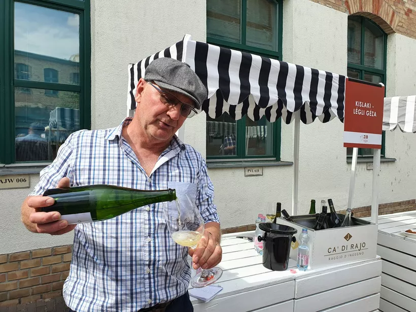 Török Csaba csóválja a fejét. Elkéstünk, az ő pezsgője sajnos már elfogyott, így aztán Szittnyai Zalán standja felé vesszük az irányt, ahol a borkereskedés szakmai vezetője a külföldi pincészetek remekeit kínálja – ahogyan ő mondaná – boldog örömmel. Egy szűretlen proseccóval vigasztalódunk: a Ca’di Rajo glera szőlőfajtából készült remeke maga a természetesség, és nagyon itatja magát.