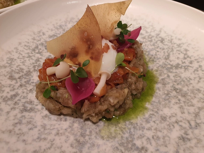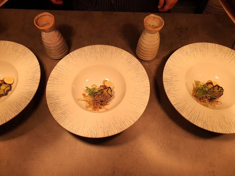 Az előétel hideg „lecsósaláta” volt, amit Onsen tojás, padlizsán, szalonna, burgonyaropogós, savanyított shimeji gomba és lila hagyma alkotott nagy harmóniában. Hozzá a móri Brigád 2024-es rajnai rizlingjét töltötték, remek volt az összhang.