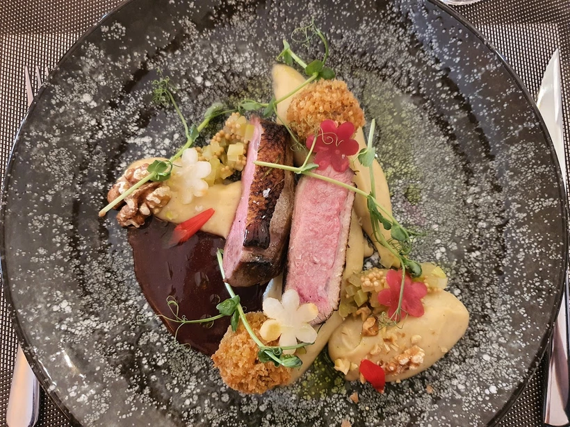 Főételként rozé kacsamell és pecsenyekacsamáj-krokett került a tányérunkra, almás zellerkrémmel, savanyított zellerrel, mustármagos almával, dióval, almacsipsszel, céklahamuval és feketeribizli-jus-vel megbolondítva. Hozzá egyik korábbi kedvencünket, a nadapi Bakos Borászat 2023-as Lover Sillerét kaptuk, ami kitűnő választásnak bizonyult.