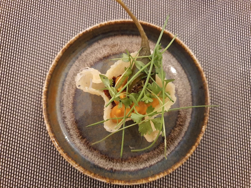 A konyha üdvözleteként parmezáncsipsz, száras kapri, paradicsom, majonéz és egy adag mikrozöld került a tányérra. Friss volt minden, üde, és szerettük a textúrák játékát.