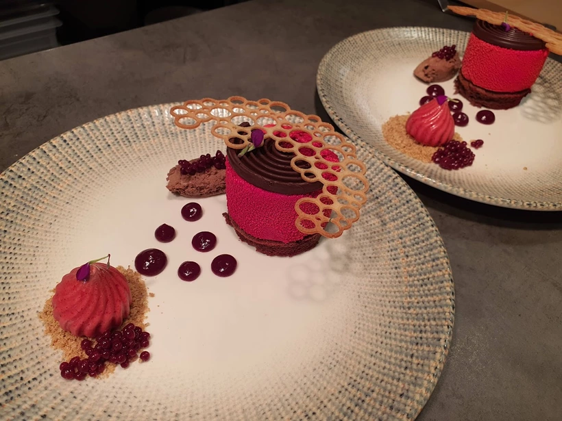Étkezésünk koronájaként végignézhettük, ahogyan Krisztián megalkotja a desszertünket. Lúdláb Neológ au Chef. Ámulva csodáltuk, hogyan kerülnek rá újabb és újabb rétegek, és a látványnál már csak az íze volt izgalmasabb: tobzódtunk a meggyben. Kakaós piskóta, étcsokimousse, rumosmeggy-coulis, meggykaviár, meggysorbet, házi meggylekvár és ropogós tüll alkot elképesztő ízorgiát a tányéron, és bár elsőre kicsit meghökkentőnek tűnik, még a nadapi Fuchs Ujvári Pince 2023-as D-moll fantázianevű vörös házasítása is illett mellé.