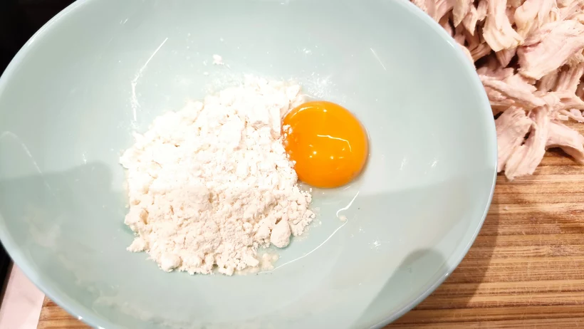 2. Közben elkészítjük a habarást: egy nagyobb tálban simára keverjük a tojássárgáját a joghurttal, majd fokozatosan hozzáadjuk a lisztet.
