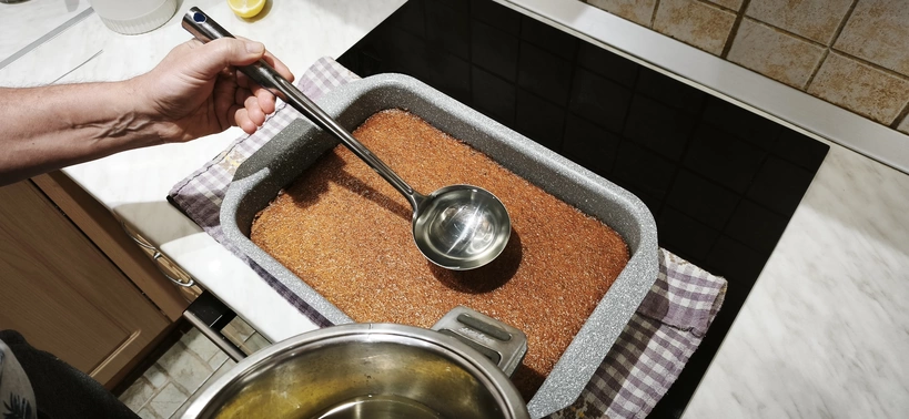 6. A kész tésztát kivesszük a sütőből, és 10 percig pihentetjük, majd egy merőkanállal rákanalazzuk a közben langyosra hűlt szirupunkat (természetesen a citrom nélkül). Szeletelés előtt hagyjuk egy fél órát állni, de ha vendégségre készül, egyszerűen tartsuk hűvös helyen vagy tegyük hűtőbe, és közvetlenül tálalás előtt is szeletelhetjük.