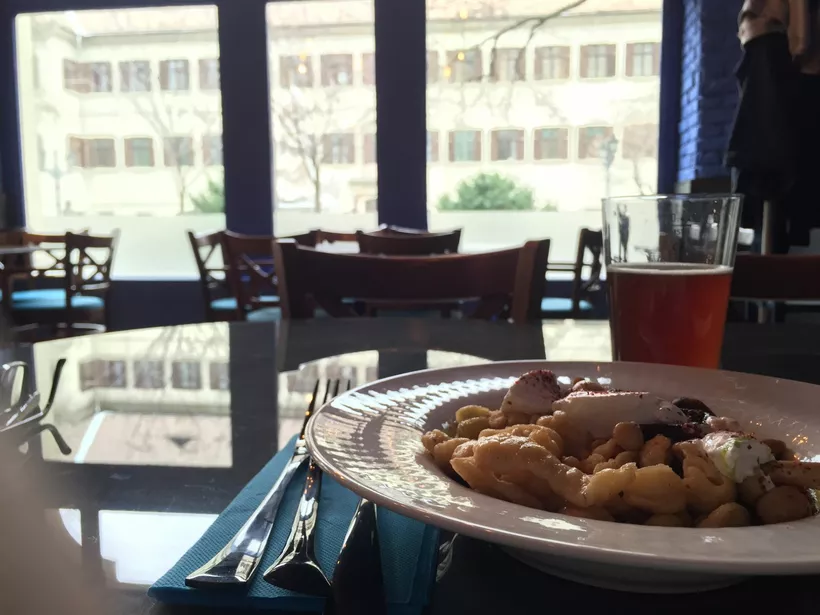 Kis tanakodás után a fokhagymás spenóttal és fenyőmaggal kísért habart tojásos rétest, valamint a bajor burgonyasaláta társaságában érkező rántott sertéstarját választottuk, a rendes étlapról pedig egy gombapaprikást rendeltünk. A hely szellemének megfelelően természetesen sörrel kísértük az ebédet, ami ezúttal a ház búzasörét jelentette. Utóbbi hamar meg is érkezett, a többire viszont – ebédmenühöz képest – sokat kellett várni, de ezt egyrészt betudtuk a kezdeti nehézségeknek, másrészt az első falatoknál meg is bocsátottuk.