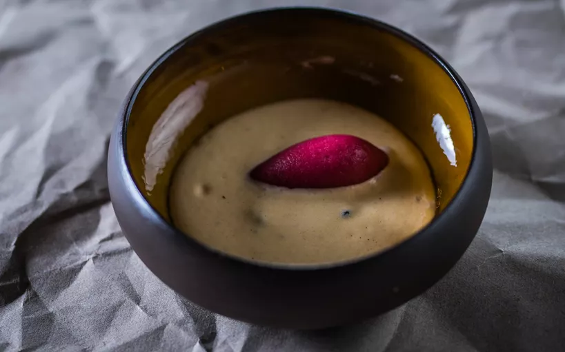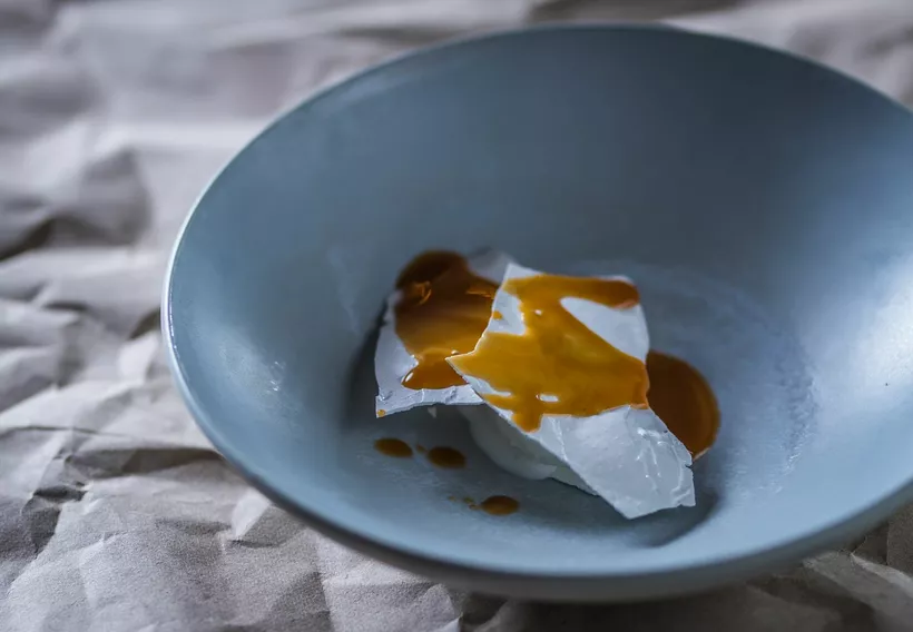 Hogy a tőkehal valamilyen formában elő fog bukkanni ezen az estén, arra számítottunk. A quinoa se lepett meg nagyon senkit, a következő fogásban megjelenő tojássárgája azonban az est egyik legizgalmasabb komponense volt. „Nagyon egyszerű elkészíteni” – nyugtatta meg a közönséget a vacsora végén Daniel Berlin. Svédországban a tarisznyarákot érlelik hasonló módon. Augusztusban lehalásszák, aztán úgy kezelik, mint ezt a tojást, és amikor hideggé válik az idő, előveszik a nyár ízeit rejtő rákocskákat. Rögtön eszünkbe is jut az angol gyep, ami szinte magától olyan lesz, és azonnal feladjuk az ábrándot, hogy legközelebb magunk is elkészítjük ezt a tojást. Kóstolni viszont nagy élmény volt. A Budaházy Pincészet 2015-ös Nyulászó Furmintját kaptuk a fogás mellé, ami a tőkehal miatt igen jó választásnak bizonyult, de összekóstoltuk a szamorodnival is, és azzal pedig az érlelt tojás kommunikált nagyon szépen. (Őszintén reméljük, hogy Horváth Gábor, a mádi Gusteau séfje megtanulja majd az eljárást, és felveszi az étlapjára. Megér egy zarándokutat.)
