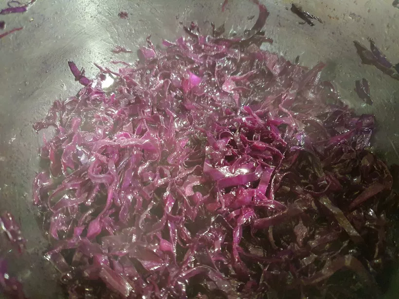 5. Elkészítjük a párolt káposztát. A lila káposzta torzsáját eltávolítjuk, és a káposztát vékony szálakra vágjuk. Egy vastag falú edényben felhevítünk 3 evőkanál kacsazsírt, és beleszórjuk a cukrot. A lábost mozgatva addig melegítjük, míg a zsírban a cukor mogyoróbarna színűre karamellizálódik.