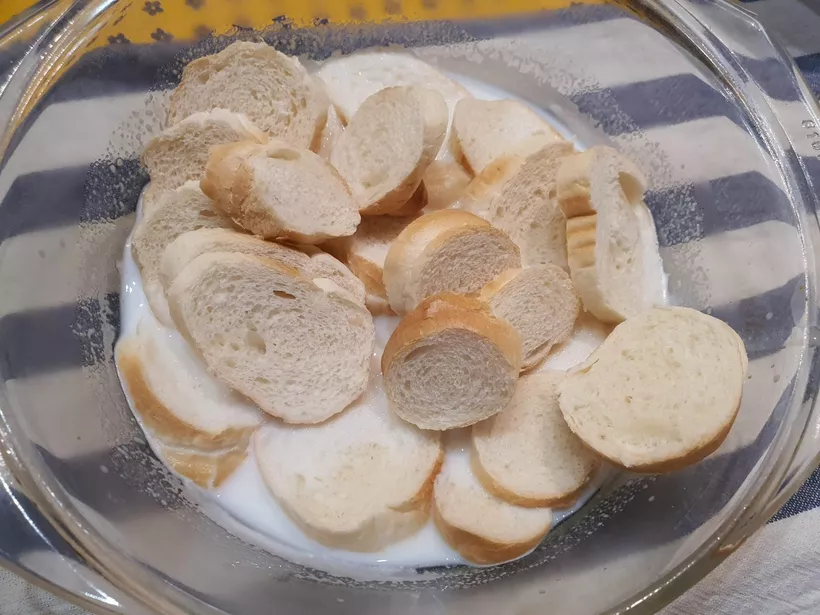 4. Négy kiflit ujjnyi vastag karikákra vágunk. Egy nagy maréknyit tálba teszünk, rámerjük a forró tejet, és hagyjuk, hogy a tészta magába szívja a nedvességet. Ha már alaposan átitatódtak a kiflikarikák, egy szűrőlapáttal felveszünk egy adagot, kanállal egy kicsit kinyomjuk belőle a tejet, és elterítjük a vajjal kikent tepsi alján. Egy kicsit meg is paskolhatjuk. Ha kész, jöhet a következő adag kifli, azt is kinyomkodjuk egy kicsit, és mehet a tepsibe. Ha ügyesek vagyunk, a négy kifli éppen beteríti a tepsi alját, összefüggő tésztaréteget képezve.