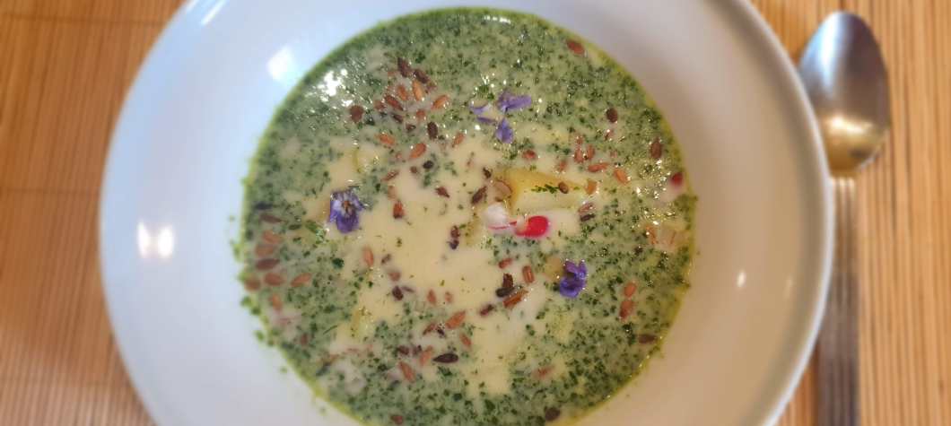 Friss kincseinkkel boldogan mentünk haza, alig vártuk, hogy megkóstoljuk a cseresznyeszemnél alig nagyobb, ízletes retkeket. Igen ám, de mi legyen a zölddel? A retek levele friss, édeskés ízű, és mivel biokertben termett, teljesen vegyszermentes, tehát nyugodtan felhasználható a konyhában. Mivel korábban azt tanultuk, hogy ami egyszerre érik, az össze is illik, ezért úgy döntöttünk, hogy kreálunk egy gyors zöld levest, amelyben a retek levelei mellett a frissen szedett medvehagyma lesz a főszereplő. Tökéletes lett, így a receptet is közreadjuk.