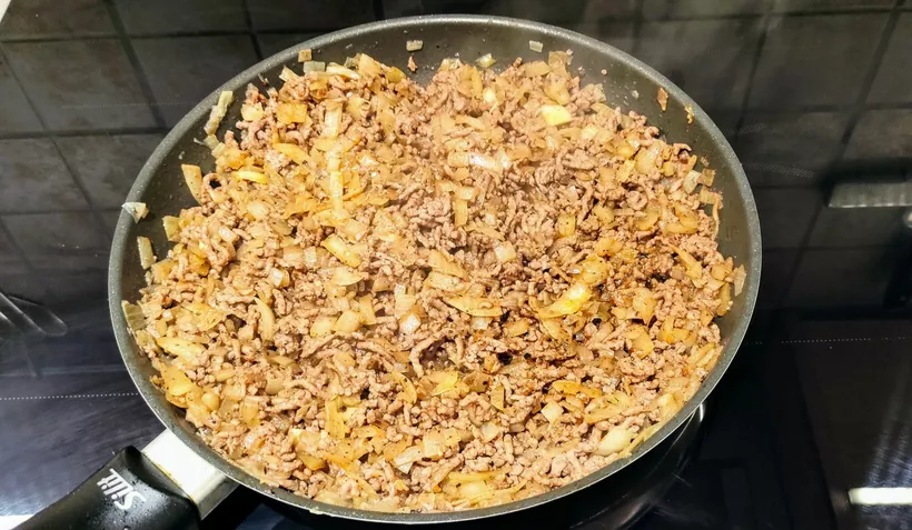 2. A darált húsos töltelékhez az apróra vágott hagymát napraforgóolajon üvegesre pirítjuk, majd hozzáadjuk a darált húst és a fűszereket, és az egészet összepirítjuk.