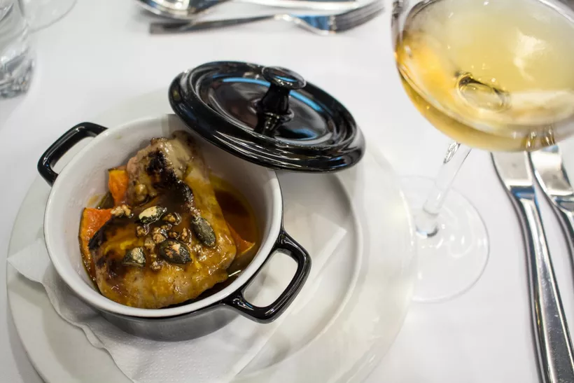 A testes, fűszeres furmint selection méltó párja volt a hozzá tálalt zeller-mangalica kombinációnak, és aztán következtek az igazi „nagyvadak”. A 2013-as évjáratú 5 puttonyos tokaji aszút libamáj és sütőtök kombójával szolgálták fel, a 2006-os 5 puttonyos aszú ízes sajttal és szarvasgombával érkezett. Mindkettő tökéletesen eltalált párosítás volt, megmutatva, hogy nem szabad az aszúkat csak az édességek világába beszorítani.
