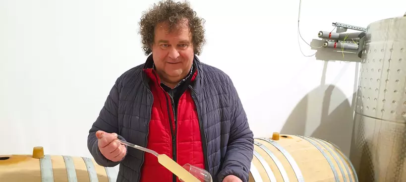 „Itt van ni, ez a 2019-es! A szüret után 30 nappal megjelentek benne azok az ízek, amik utána ugyan eltűntek, de 3-4 hónapos korában visszatértek, és ezt azóta is tartja!” És a bor már ott is van a poharunkban, vibráló savakkal, fehér virágos, finoman csonthéjas aromákkal. „Ez meg a Szent Tamásról jött, annak is a déli oldaláról, andezites, zeolitos területről. Új hordóba került, 2018 óta mindig a Szent Tamás kapja az új hordót.” Ezt is megkóstoljuk: lestyán, naspolya, kő, ásvány, sűrű szövetű nagy anyag, vajon milyen lesz majd a palackban?