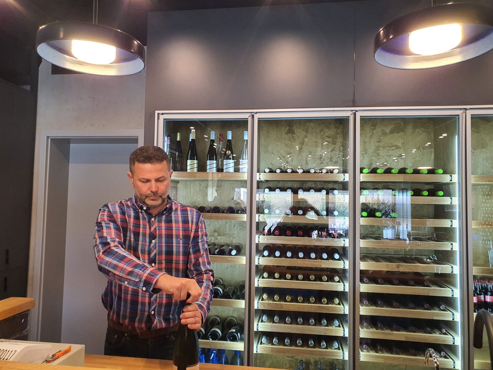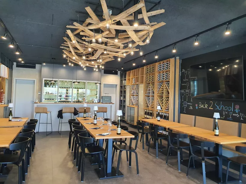 BSZM: Ugye? Olyan kóstolóteret álmodtunk ide, ami akár Budapest belvárosában is megállná a helyét. Támogatjuk a kortárs művészeket, a kerámiafalunkat Zakar István készítette. Kijött velünk a szőlőbe, és teljesen beleszeretett a részben teraszos kialakítású tihanyikék-ültetvényünkbe. A zöld sávok a teraszokat jelképezik, a színek pedig a négy bortípust, de sok mindent beleláthat az ember.