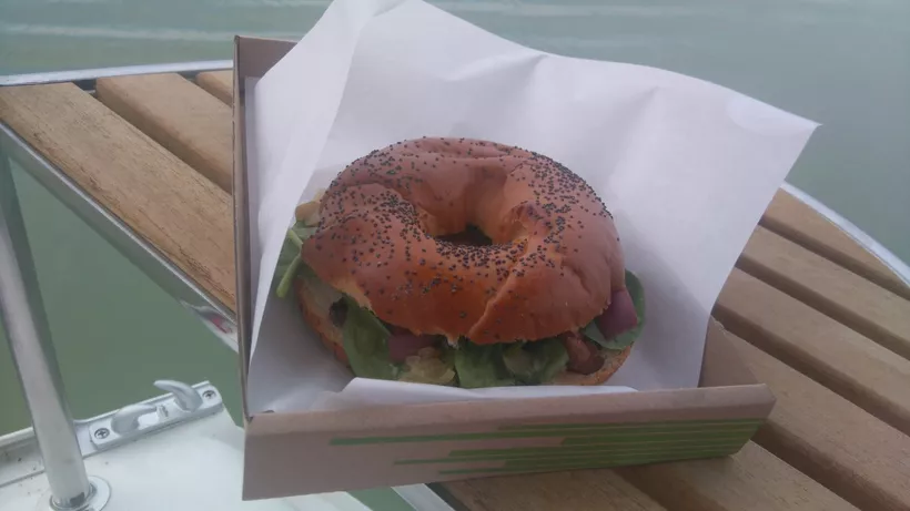 A ponty hasaaljának füstölésére Bezerics Dani apósa vállalkozott. A hal borókabogyóval, kaporra és fokhagymával ízesített 6%-os sóoldatban tölt 8-12 órát, majd három órán át füstölik. A végeredmény lenyűgöző. Omlós, friss füstölt hal, nagyszerű arányokkal, aki megkóstolja, szeretni fogja. Ez kerül Komáromyék bagelébe, egy kis sajtkrémmel, bébispenóttal, konfitált fokhagymával és marinált lila hagymával. Mennyei szendvics.