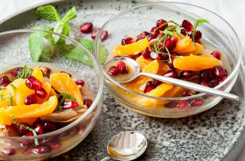 Narancsszeletelés közben elképzeltük, hogy a lédús gyümölcsöt most szedtük a fáról Marokkó napsütötte tájai egyikén… A narancsok tetejére gránátalmát morzsolva, dióval megszórva, fahéjjal meghintve, egy kevés mézzel fogyasztva mennyei eledel.
