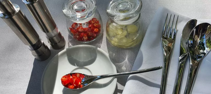Limonádét kapunk, hűs és finom, majd megérkezik a teríték is. Gyönyörű, jó fogású, elegáns evőeszközök, só- és borsmalom, kis tégelyekben szeletelt csilipaprika és marinált fokhagyma – ez már a levesünk miatt, hiszen a napi ajánlatban szereplő pho-t természetesen meg kell kóstolni.