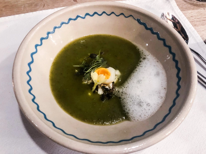 A konyhaajtót „kitárva” az ismeretlen „Mező”-re lépünk, ahol roppanós hajdinával, juhsajttal és ordával tálalt medvehagyma-krémlevessel várnak minket – a fogás zöldjében jól mutat a füstölt fürjtojás sárgája. Az enyhén savanykás, kellemes, telt ízekkel teli leves a tavasz első pillanatait idézi meg. Minden kanálhoz a Meinklang nevű, itthon is jól ismert osztrák pincészet Grüner Veltliner borát kortyolgatjuk: a kellemesen testes bor nagyon jól passzol ehhez a fajsúlyosabb, erőteljesebb leveshez. A mező az éttermi csapat számára is fontos helyszín, reggelente ugyanis innen szedik azokat a virágokat, amelyek esténként a vendégek asztalait díszítik. Miközben felszolgálónk mesél, látjuk a szemében a csillogást, ebből is érezhető, hogy számukra is nagyon sokat jelentenek a közös séták.