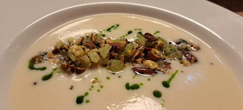 Bájos tesztelőtársaim – az egyszerűség kedvéért legyen a nevük Nóra és Rebeka, velük még találkozhatnak étteremajánlóimban – hazai ízekre vágytak. Ezeket az étlapon spenótfőzelék képviselte, ötféle választható feltéttel (kacsacomb, kacsamell, posírozott marhapofa, fűszeres sertésoldalas és Angus steak). Az én választásom egy pompás, zöldalmával és pirított magvakkal dúsított zellerkrémleves után a kacsamellre esett.