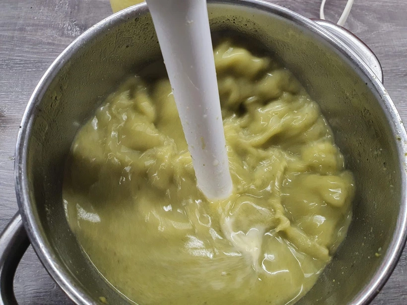 2.Amikor a brokkoli megpuhult, hozzáadhatjuk a zúzott fokhagymát, majd a tűzről levéve botmixerrel pürésítjük a levest, és hozzákeverjük a habtejszínt is.