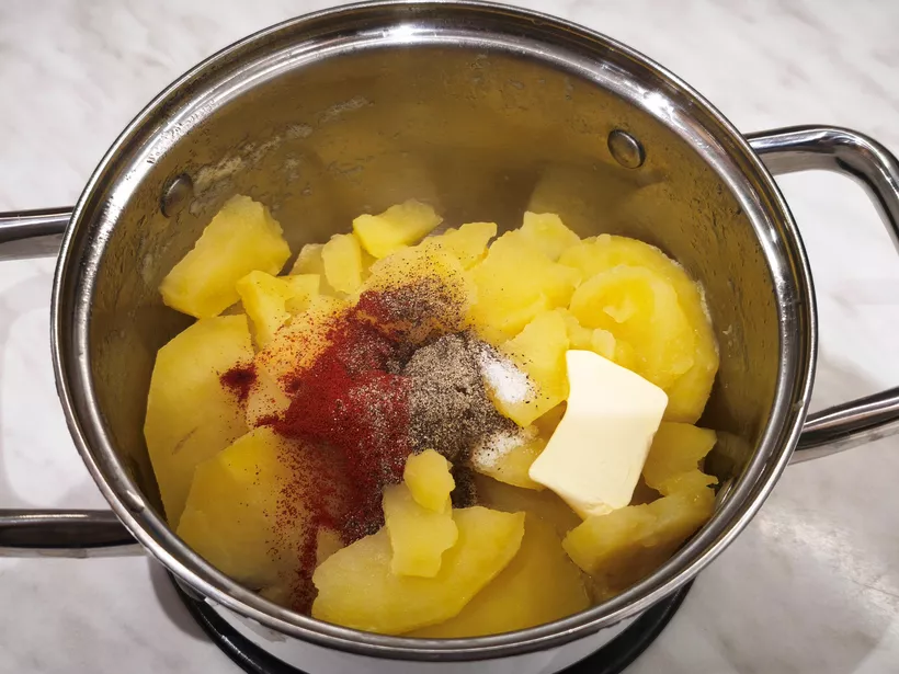 3. A megfőzött, áttört krumplit elkeverjük a vajjal, és összedolgozzuk a fűszerekkel.