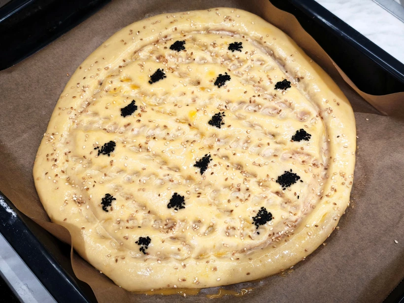 5. A kész töltött tésztát sütőpapíros tepsire tesszük, letakarva pihentetjük, amíg kissé újra meg nem kel. Ezután felvert tojással lekenjük, formázzuk a tetejét, majd megszórjuk magvakkal. 180 fokra előmelegített sütőben aranybarnára sütjük.