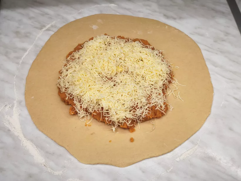 4. A megkelt tésztát lisztezett felületen átgyúrjuk, gombóccá formázzuk, majd nem túl vékonyra nyújtjuk. Közepére halmozzuk a fűszerezett burgonyát, megszórjuk reszelt sajttal, majd a tésztát ráhajtjuk, és a tésztaszéleket összenyomkodva lezárjuk. A tetejét meglisztezzük, majd megfordítjuk, és óvatosan tovább nyújtjuk.