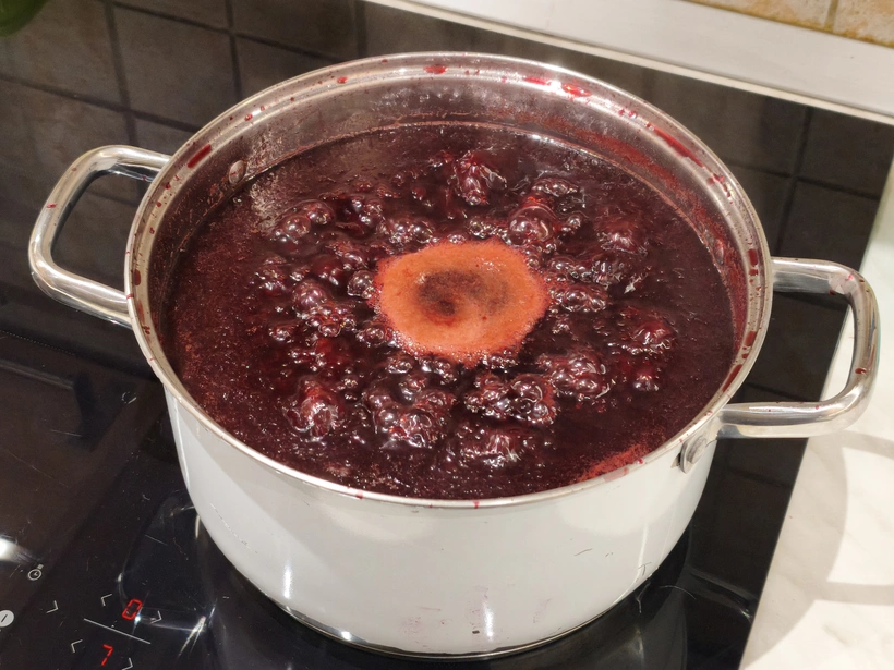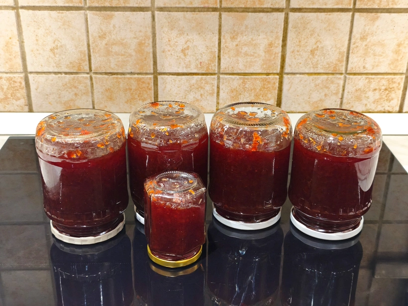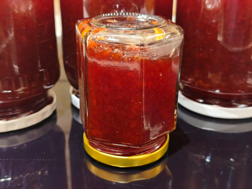 A főzés végén a kész lekvárban a folyadék összességében körülbelül az ötödével kevesebb, akkor már a leve is viszkózus. A citromlevet, a citromsavat, az ecetet és vajat, én csak a főzés második felében adtam hozzá.