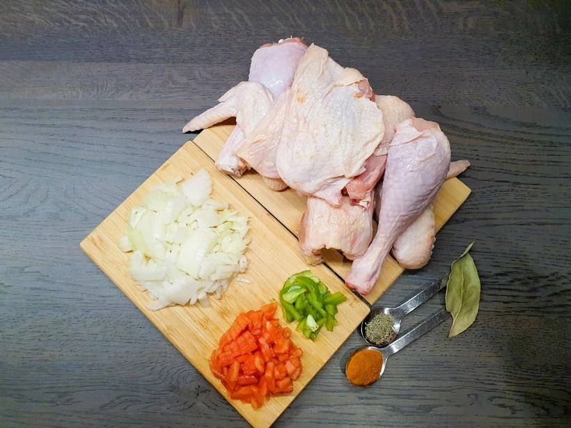 1. Az egész csirkét feldaraboljuk, a csirkedarabokat megmossuk, előkészítjük, a hagymát és a fokhagymát megtisztítjuk és finomra vágjuk, a paradicsomot és a paprikát megmossuk és apróra vágjuk.