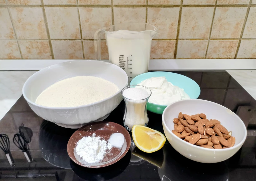 1. A joghurtot és a cukrot egy mély tálban addig keverjük, amíg a cukor teljesen fel nem oldódik. Ez adja a tészta alapját, amelyhez ezután fokozatosan hozzáadjuk a többi hozzávalót: a búzadarát, a sütőport és a szódabikarbónát. Lassan, egyenletes mozdulatokkal dolgozzuk össze, amíg egynemű, sűrű, kanállal formálható masszát kapunk. Az összekeverés után valójában kézzel gyúrja össze legkönnyebben az ember: gyúrjuk jó néhány percig, hogy közben a dara minél többet be tudjon szívni a joghurtból.
