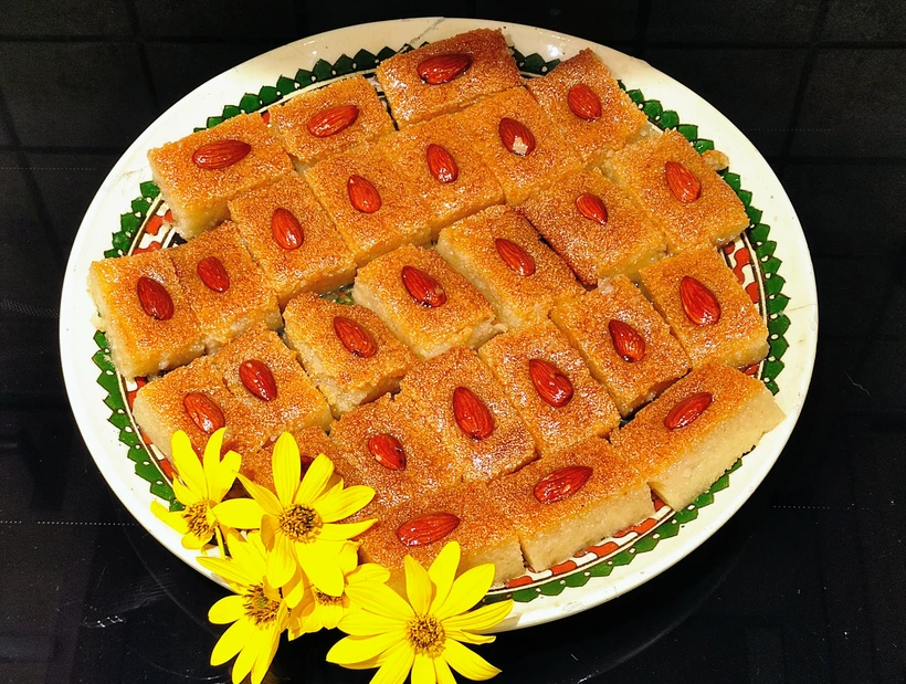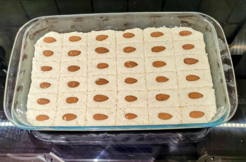 4. Közben elkészítjük a şerbetet, vagyis a szirupot: a vizet és a cukrot felforraljuk, majd a végén hozzáadjuk a citromlevet (vagy egy negyed citromot), és néhány percig forraljuk. Amint a süteményt kivesszük a sütőből, azonnal, még forrón ráöntjük a forró şerbetet (ha már nem forr, a süteményre öntés előtt forraljuk fel). Fontos, hogy mindkettő forró legyen – így a szirup egyenletesen szívódik fel, és nem ázik el a tészta. Ezután a şambalit legalább 4–5 órát pihentetjük a szirupban, de a legjobb, ha egy éjszakán át állni hagyjuk. A tetején még másnap is állni fog egy kis szirup, ettől nem kell megijedni: a maradék szirupot tálaláskor kanalazzuk a szeletek tetejére.
