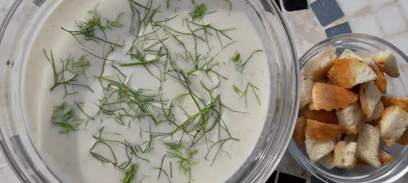 Az édeskömény finomra vágott levelével és egy gondolatnyi fehér borssal meghintve kínáljuk, de ha dúsabban szeretnénk, adhatunk hozzá pirított kenyérkockát is.