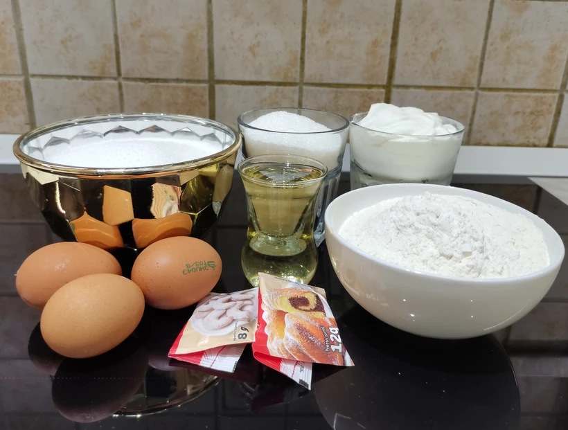 A három tojást a cukorral habosra keverjük. Hozzáadjuk a joghurtot és az olajat, majd a vaníliás cukrot és a sütőport. Ha szép sima a tésztánk, belekeverjük a lisztet, és közepes méretű, tapadásmentes tepsiben 170 fokon légkeverés nélkül aranybarnára sütjük.